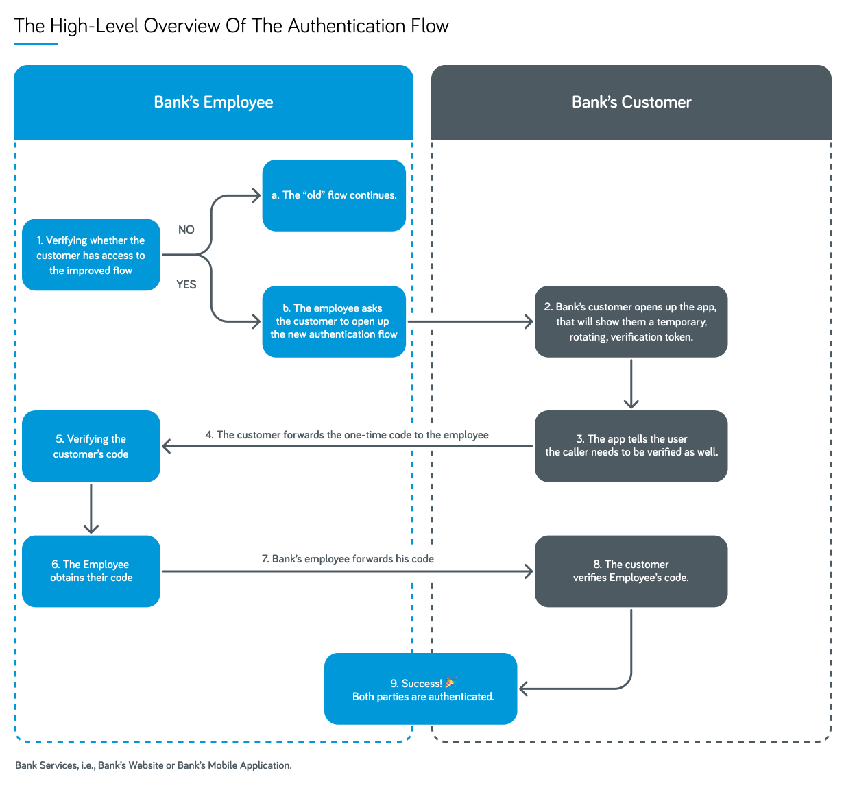 Nowadays, most bank customers have secure access to bank accounts with web services or mobile applications. These may be used to authenticate communication parties who are in touch through non-secure channels, such as over a phone call. The flow is more or less the same as you may see on the image below: